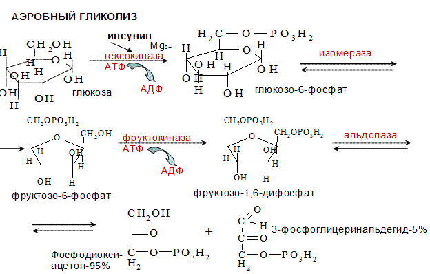 АЭРОБНЫЙ ГЛИКОЛИЗ – процесс окисления глюкозы до СО2 и Н2О, протекающий в присутствии кислорода. Все ферменты, катализирующие реакции находятся в цитозоле клетки.