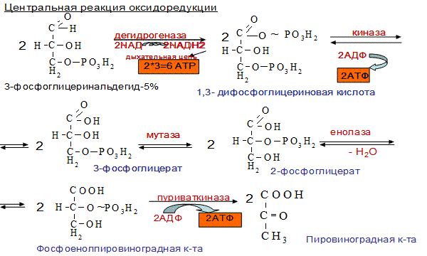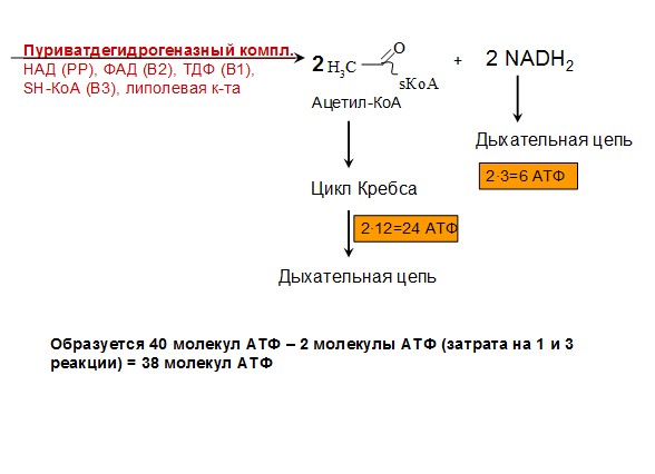 ЭФФЕКТ ПАСТЕРА. Заключается в угнетении дыханием (О2) анаэробного гликолиза, т.е. происходит переключение с аэробного гликолиза на анаэробное окисление. Если ткани снабжены О2, то 2НАДН2, образовавшийся в процессе центральной реакции оксидоредукции, окислится в дыхательной цепи, поэтому ПВК не превращается в лактат, а в ацетил-КоА, который вовлекается в ЦТК.