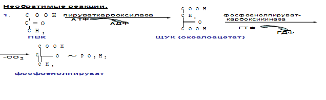 1. Пируваткиназная – образование фосфоенолпирувата из ПВК происходит в ходе 2-х реакций, первая из кот. протекает в митохондриях. ПВК транспортируется в матрикс митохондрий и там карбоксилируется с образованием оксалацетата (ЩУК). Фермент-пируваткарбоксилаза, коферментом которым является биотин. Реакция протекает с использование АТФ. Затем оксалацетат (в цитозоле) превращается в фосфоенолпируват входе реакции, катализируемой фосфоенолпируваткарбоксилазой – ГТФ-зависимым ферментом (-СО2, ГТФ → ГДФ).