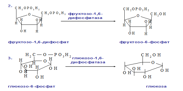 2. Фосфофруктокиназная: ФР-1,6-дифосфат →Фр-6-фосфат под действием фермента фруктозо-1,6-бифосфатаза.