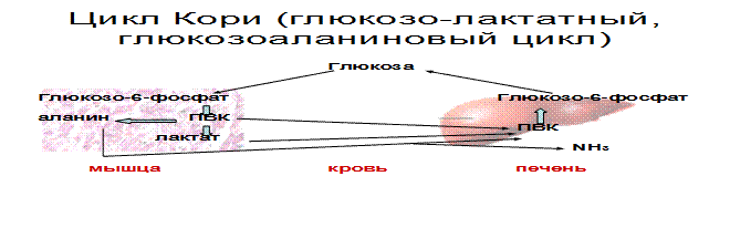 (взаимосвязь гликолиза в мышцах и глюконеогенеза в печени).