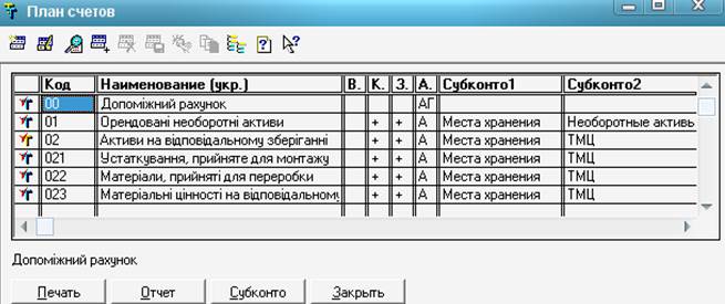 1) Піктограма у вигляді букви “Т” – жовтий колір піктограми означає, що облік за даним рахунком ведеться тільки у розрізі субрахунків, синій колір – субрахунок рахунку, червоний прапорець – рахунок чи субрахунок можна редагувати тільки у режимі конфігурації
