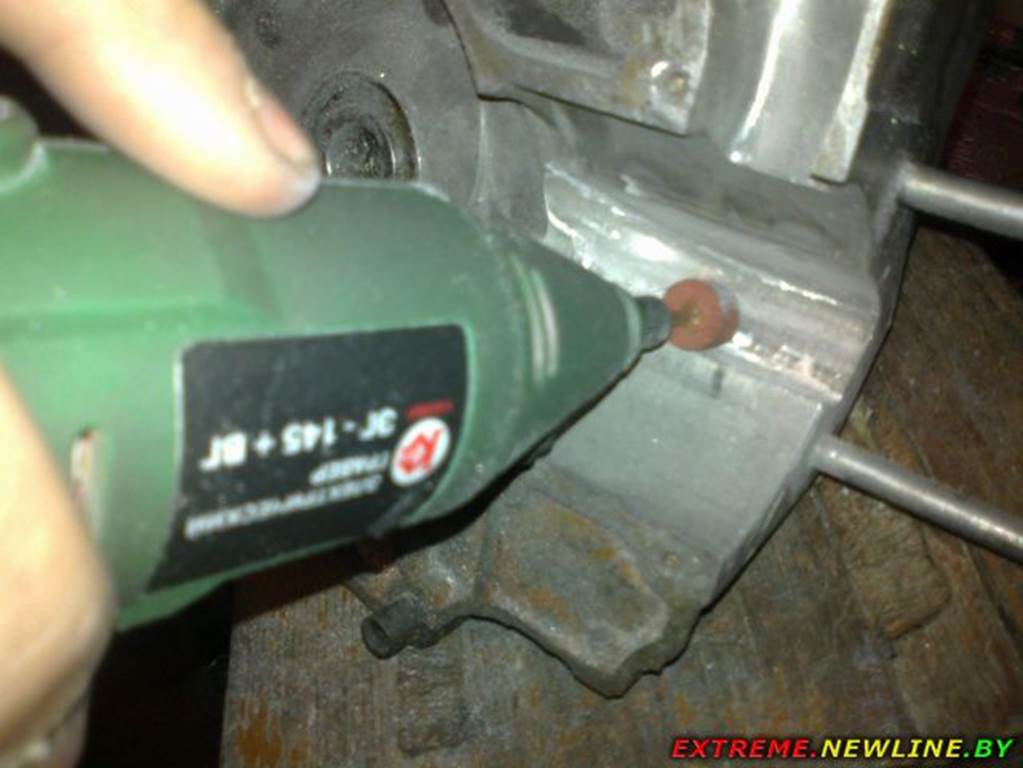 На фото работа гравера по доработке продувычных каналов картера двигателя. Дело в том что на картере Восход-2 каналы уже чем у цилиндра от Восхода-3, поэтому их пришлось тоже все подгонять.Также все пришлось подгонять под явовский размер карба и дорабатовать крепление.