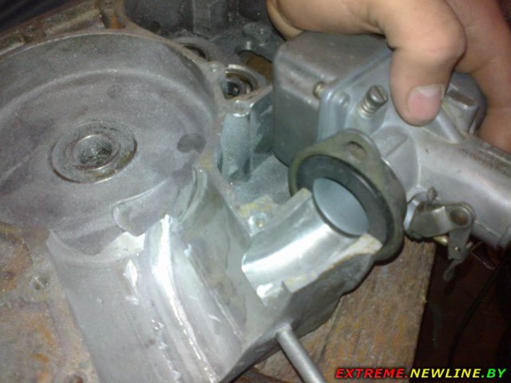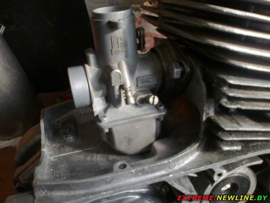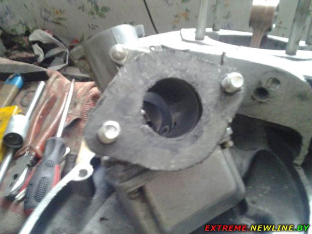 На родные шпильки карб не садился, пришлось их убирать и пересверливать другие чуть пошире. Под карб для надежности была установлена еще паранитовая прокладка. Карб крепится родным восьмерочным креплением двумя болтиками на М8.