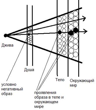 Для этого обращусь к азам Родосвета – знания законов бытия Всемирья. Рассмотрим базовую схему Родосвета. Согласно ей, всё Сущее и Несущее образуется из Изначального Света – Духа Всевышнего, действующей формой которого является Жива. Изначальный Свет включает в себя все возможные спектры и уровни энергий, как белый свет содержит в себе весь видимый спектр. И из него, идущего от Центра Всемирья – Камня Алатыря, путём преобразования и уплотнения проявляются все остальные формы энергий и материй. Джива – индивидуальная, самосветящаяся частица Изначального Света, является истинным «Я» Человека. Именно Джива наполняет энергиями Образы, находящихся на разных оболочках нашей Души. Преобразуясь через образы, как через абажур, Изначальный Свет создает нашу физическую оболочку и весь окружающий мир во всём многообразии. Наши болезни и проблемы – это проявления некоторых образов нашей Души.