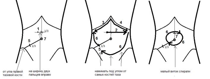 6) Далее по спирали. Большой виток. Прожимая каждую точку, поднимаемся до правых ребер; от левых ребер опускаемся вниз, по низу живота. Продавливаем достаточно полого, где-то 30̊º к горизонтальной плоскости, чтобы не давить на околопочечное пространство. И ещё один виток вокруг пупка, где-то на 5-6 см от пупка нажимаем под более крутым углом, около 60º к горизонтальной плоскости, малый виток. Если мысленно провести вертикальную ось через пупок, то все нажатия будут вглубь, в направлении этой оси. Это важно, чтобы не смещать орган (кишку) в неестественном направлении. Здесь же хочется упомянуть, что гинекология женщин начинается под желудком и тонким кишечником. Отёки в этих органах ухудшают кровоснабжение органов малого таза, что приводит к различным проблемам. Гинеколог лечит ниже, работая лишь со следствиями недостаточного кровоснабжения, не устраняя причину. Отчего походы к гинекологу становятся регулярными, осложняя жизнь для всего организма побочными действиями лекарств и манипуляций, последствиями операций и т.п.