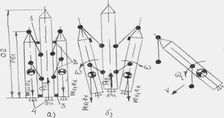 Рисунок 7 - Отвод боковых блоков с разворотом относительно нижнего узла силовых связей: а - выключение двигателей боковых блоков, разрыв верхних силовых связей, начало разделения; б - разворот боковых блоков относительно нижнего узла связей под действием системы сил Р= та;