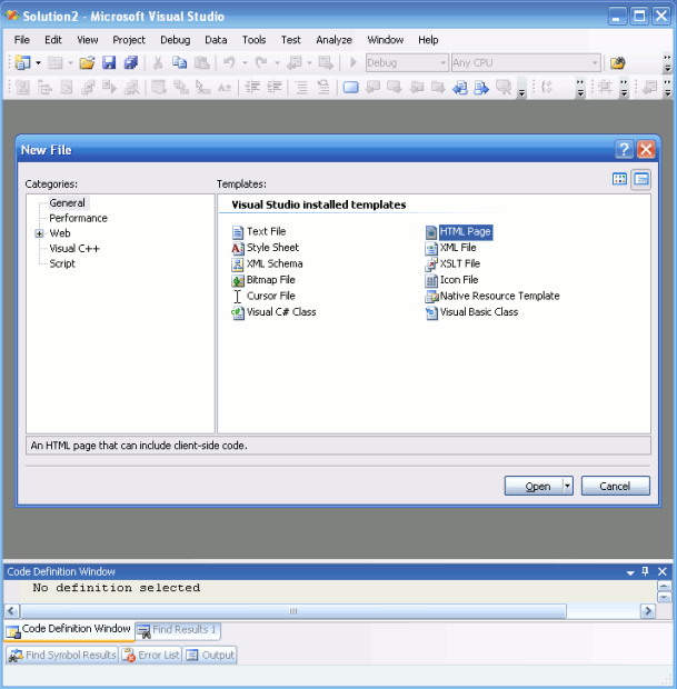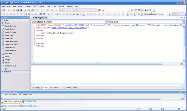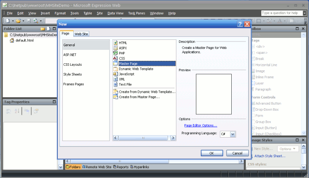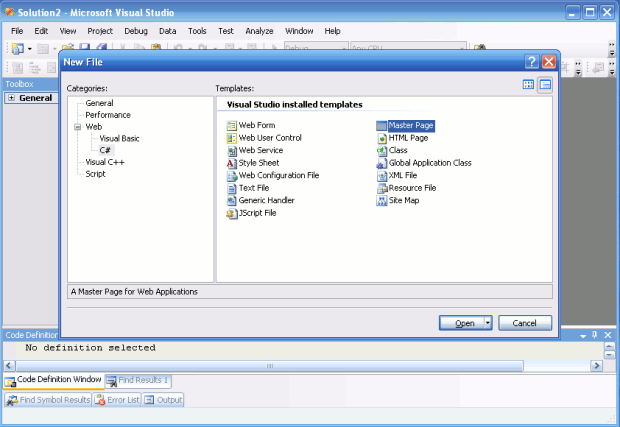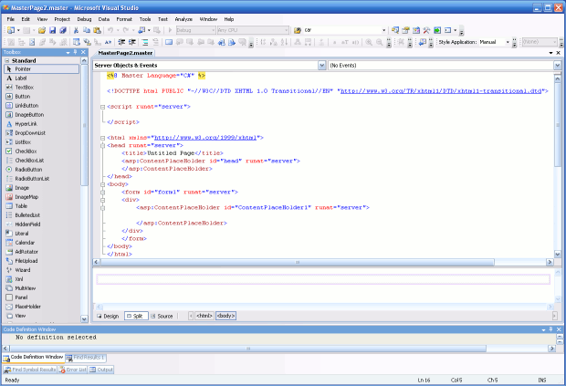 Для дизайна веб-страниц в Visual Studio. NET необходимо выбрать раздел меню File => New и в открывшемся окне выбрать тип файла HTML Page: увеличить изображение Для дизайна имеется панель Toolbox, содержащая набор основных элементов html страницы (подключается через меню: View > Toolbox): увеличить изображение - Создание мастер-страницы в Microsoft Visual Studio. NET.