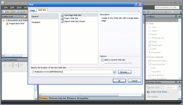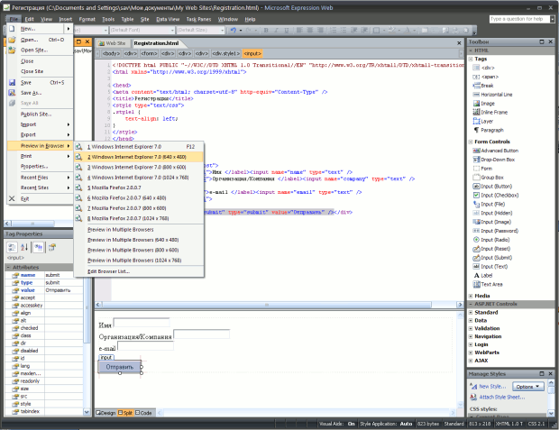 Microsoft Expression Web можно использовать в качестве визуального редактора документов разнообразных форматов: HTML, ASP.NET, PHP, CSS, JavaScript, XML. Поддерживается работа с шаблонами, мастер-страницами и веб-сайтами в целом. Выбрав раздел меню File > New, вызовите следующее диалоговое окно: увеличить изображение Выберите формат документа HTML. В результате появится следующее окно, содержащее пустую HTML страницу: увеличить изображение Используя панель инструментов (Toolbox), создайте веб-страницу для регистрации пользователя следующего вида: увеличить изображение Для удобства вставки элементов формы рекомендуется использовать в качестве контейнера элемент <div>. После сохранения документа (File > Save As) можно предварительно посмотреть страницу в одном из веб-браузеров: - Создание веб-сайта.