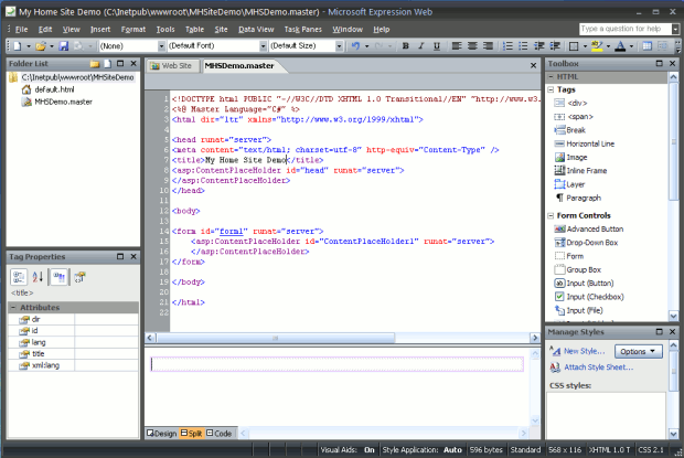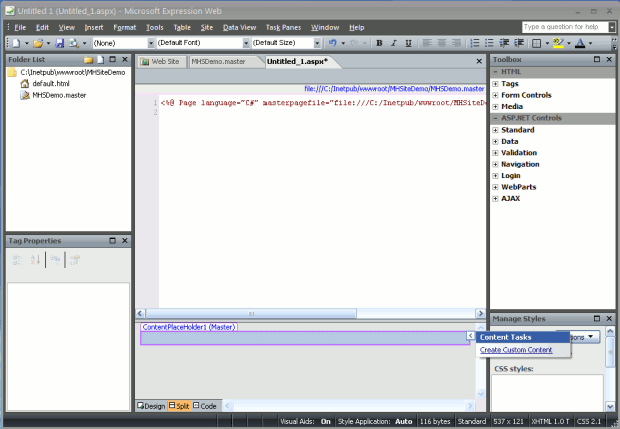 Для создания мастер-страницы необходимо выбрать раздел меню File => New и в открывшемся окне выбрать тип файла Web > C# > Master Page: увеличить изображение После этого появится окно мастер-страницы, содержащей пустую форму и два контейнера содержимого ContentPlaceHolder (в заголовке и в теле документа): увеличить изображение - Знакомство с Microsoft Expression Web