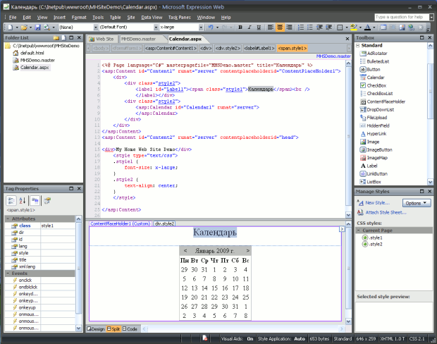 Microsoft Expression Web 2 позволяет разрабатывать веб-страницы, интегрирующие в рамках веб-сайта такие технологии как XML, CSS 2.1, ASP.NET 2.0, XHTML, XSLT и JavaScript., а также внедрять в страницы управляющие элементы ASP.NET, Microsoft Silverlight и AJAX. Для работы с этим инструментом требуется наличие установленной компоненты .NET Framework 2.0. На странице http://www.microsoft.com/expression/products/overview.aspx?key=web имеется ссылка на обучающее руководство, демонстрирующее основы работы с этой средой разработки. В частности там демонстрируется создание пустого веб-сайта, мастер-страницы, стилевого оформления, создание *.asp страницы. Также показывается каким образом можно добавить поддержку RSS на сайте и как создать страницу содержащую элемент управления Silverlight для просмотра видео. Одно из упражнений посвящено внедрению элемента управления.NET для отображения данных из источника на основе XML. Показано также, как вставить AJAX элемент на страницу для асинхронного вызова функции и обновления индикатора времени. Необходимо уделить особенное внимание созданию мастер-страниц. Поскольку страницы веб-приложения составляют некое единое целое, объединенное едиными требованиями к оформлению, содержанию, расположению элементов управления, то создаваемые веб-страницы сегодня очень редко разрабатываются "с нуля". Обычно при создании страниц используются готовые шаблоны, либо они создаются в процессе разработки веб-страниц приложения. Одним из средств решения подобных задач являются мастер-страницы (master pages). Они реализуют простую модель создания шаблонов форм с возможностью их повторного использования. Для реализации данного механизма существуют такие типы страниц, как мастер-страницы (master pages) и страницы содержимого (content pages). - Мастер-страница представляет собой шаблон страницы, который может содержать любые элементы, допустимые для обычной страницы, а также программный код. Обычно мастер-страница содержит фиксированные элементы, одинаковые для всех страниц, и заполнитель содержимого для остальной части страницы. Наиболее типичными фиксированными элементами являются верхний и нижний колонтитулы, панель навигации, панель меню и другие.
