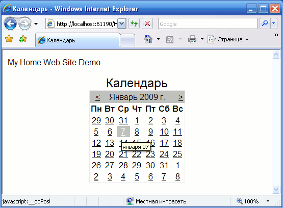 Для создания пустого веб-сайта выберите раздел меню File > New, затем на закладке Web Site выберите Empty Web Site и укажите расположение сайта: В качестве шаблона для создания страниц веб-сайта можно использовать мастер-страницу: Созданная мастер-страница содержит два контейнера содержимого ContentPlaceHolder: в заголовке и в теле документа: Все изменения, вносимые в эту мастер-страницу будут автоматически реплицироваться во всех документах веб-сайта, созданных на ее основе. Вся специфика вновь создаваемых документов должна быть локализована в пределах контейнера содержимого (ContentPlaceHolder). Например, в заголовке создадим общее заглавие "My Home Web Site Demo" для всех страниц веб-сайта: <head runat="server"><meta content="text/html; charset=utf-8" http-equiv="Content-Type" /><title>My Home Site Demo</title> <asp:ContentPlaceHolder id="head" runat="server"> <div>My Home Web Site Demo</div> </asp:ContentPlaceHolder></head> Для создания новой веб-страницы на основе мастер-страницы необходимо выбрать в панели списка файлов мастер-страницу и затем в контекстном меню (вызывается кликом правой кнопки мыши) выбрать раздел "New from Master Page": Далее, в режиме отображения "Split" для элемента "ContentPlaceHolder1" по стрелке справа от него следует выбрать из контексного меню раздел "Create Custom Content": В результате в коде документа появятся пара тегов <asp:Content></asp:Content>, между которыми может быть добавлено новое содержимое страницы. В качестве примера рассмотрим следующее содержимое: После сохранения документа его можно просмотреть в веб-браузере: Контрольные задания - Вставьте логотип (можно использовать любую картинку) на страницах веб-сайта, созданного в Microsoft Expression Web, путем венесения необходимых изменений в мастер-страницу сайта.