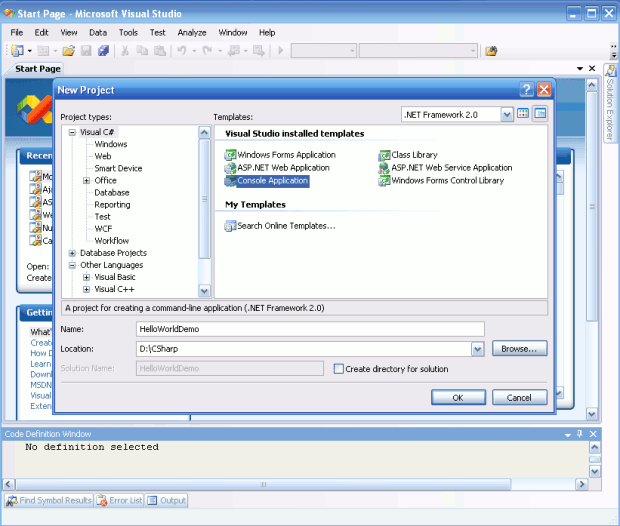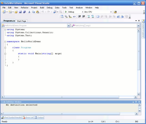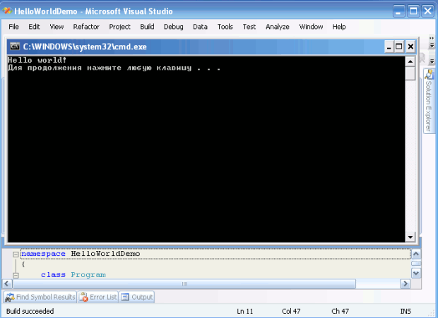 Класс проекта - Program размещен в пространстве имен, имеющем по умолчанию то же самое имя (HelloWorldDemo), что и решение, содержащее в данном примере единственный проект.