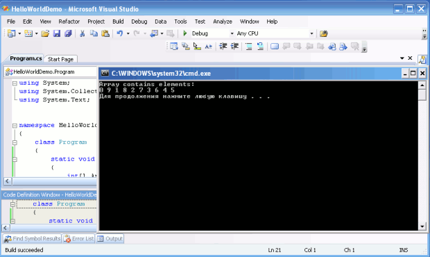 - Усложним приложение. Для этого добавим в функцию Main следующий код для вывода в консольное окно содержимого массива целых чисел: