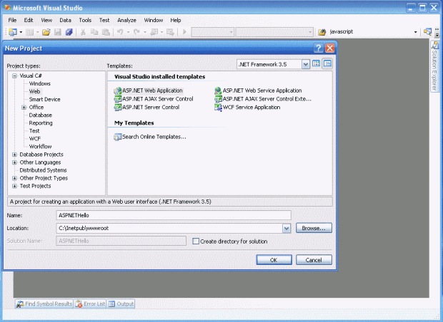 - Cоздание нового проекта в среде Microsoft Visual Studio с использованием шаблона ASP.NET Web Application: