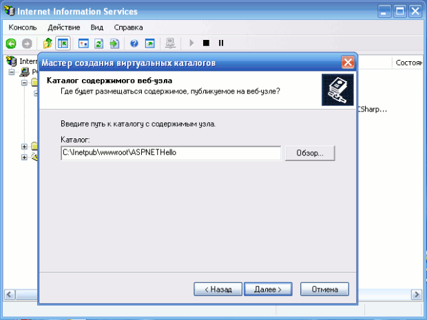 - Каждое из веб-приложений для IIS должно размещаться в своем виртуальном каталоге, которому соответствует физический каталог на диске. Для создания виртуального каталога необходимо: