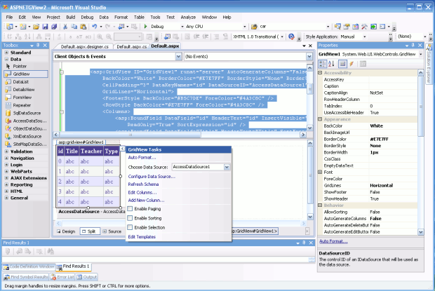 - Для элемента GridView настройте источник данных (Choose Data Source, Configure Data Source) и форматирование (можно выбрать один из шаблонов автоформатирования – Auto Format).