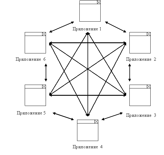 Большое количество систем, стандартов и технологий приводит к тому, что эффективно связать разные источники данных в одну систему не получается. Даже такие, на первый взгляд однородные источники, как системы управления базами данных, применяют языки запросов и форматы представления выбираемой информации, которые редко полностью совместимы между собой. Как следствие, проекты интеграции в таких условиях требуют больших усилий - требуется вникать в детали различных баз данных, протоколов, операционных систем и так далее. В результате интеграция нескольких приложений или систем реализуется по схеме, представленной ниже: