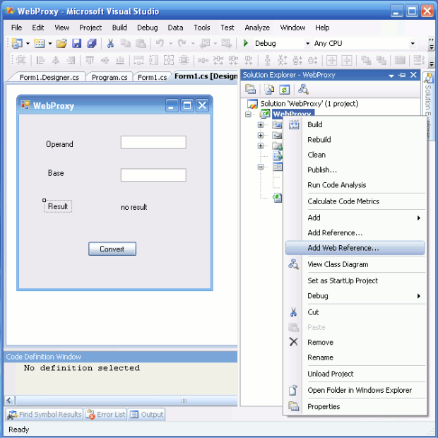 - Добавьте веб-ссылку http://localhost/ASPNETCalcWebService/Service.asmx на веб-службу ASPNETCalcWebService в проект: