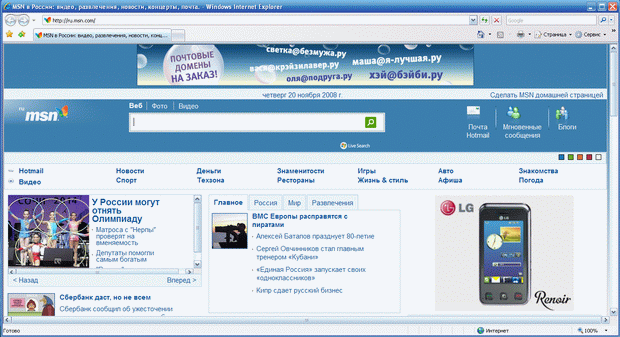В качестве примера внизу приведен скриншот главной страницы веб-портала "MSN в России".