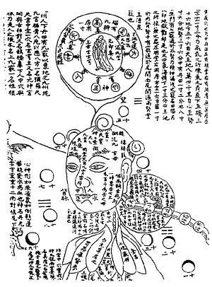 представляет собою крошечную сферу, и они вращаются вокруг одной большой сферы. Послушник, далеко продвинувшийся в деле «внутреннего достижения», способен узреть у себя в макушке девять светящихся точек вокруг светового пятна. Большое пятно — это прообраз солнца, а маленькие точки вокруг него соответствуют девяти планетам. Таким образом, в верхней части головы у каждого человека находится как бы миниатюрная модель Солнечной системы.