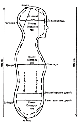Верхняя горизонтальная линия, проходящая от переносицы к затылку, именуется «линией природы». Она связана с действием внутреннего «небесного глаза» и принадлежит области верхнего Киноварного Поля. В груди, от солнечного сплетения к спине проходит «линия силы», соответствующая среднему Киноварному Полю. Наконец, в животе имеются линии двух уровней: выше пупка, примерно на уровне почек, располагается «линия сбережения судьбы», а на расстоянии одного-полутора цуней ниже пупка, то есть в области нижнего Киноварного Поля, проходит «линия пестования судьбы». Первая линия относится к области почек, или «Врат Жизни», вторая — к области нижнего Киноварного Поля.