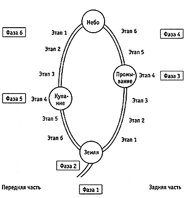 На рисунке изображен круговорот энергии в цикле дыхания. Вдоху соответствует опускание энергии в живот, выдоху — ее подъем; главное в этом упражнении — возвратное движение, которое выглядит следующим образом: при вдохе открываются нижние врата энергии, и энергия поднимается вверх по заднему каналу (в позвоночном столбе). Это восходящее течение соответствует периодам времени, обозначенным на рисунке. При выдохе закрываются верхние врата, и поток энергии может стекать вниз по переднему каналу в соответствии с указанными периодами времени. Нужно обратить внимание на то, что точки «промывания» и «купания» не располагаются точно в середине пути; первая находится несколько выше, а вторая — несколько ниже середины.