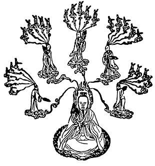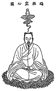 Эта картина имелась в первоначальном издании сутры «Лэнъянь-цзин», но невежественные монахи, не понимавшие ее сокровенного смысла и не знавшие о зародыше Дао, убрали ее. Этот зародыш не имеет в себе ничего вещественного, что можно было бы созерцать со стороны, но воистину есть духовная энергия человека. Сначала дух должен войти в дыхание-энергию, а потом дыхание-энергия должна объять собою дух. Когда дух и дыхание-энергия прочно соединены, а мысли перестают быть суетными и приходят к покою, это называется появлением зародыша. Дыхание-энергия должно кристаллизоваться, и тогда дух станет созидательным. Поэтому в «Лэнъянь-цзин» говорится: «Отнесись с материнской заботой к пробуждению и ответствованию». Две энергии питают и укрепляют друг друга. Посему сказано: «Каждый день есть рост». Когда энергия достаточно укреплена, а зародыш достигает полноты и завершенности, он выходит наружу через темя. Это называется «завершенным появлением зародыша сына Будды»,
