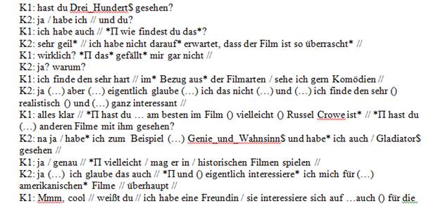 Все аудиозаписи были затранскрибированы. При записи реплик использовалась схема, предложенная Шерстиновой Т.Ю. для аннотирования звукового корпуса русского языка «Один речевой день». Выбор именно этой схемы обусловлен близостью предмета исследования – ОРД также содержит записи спонтанной, неподготовленной разговорной речи. Однако схема разметки ОРД не полностью отвечает нашим задачам, в связи с чем в нее был внесен ряд изменений: