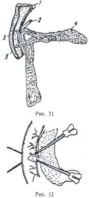 пошарово довжиною до 10 см. В просвіт рани підтягують дванадцятипалу кишку 1 і підходять до великої протоки 5 підшлункової залози, що знаходиться на відстані З— 4 см вище кута, утвореного дванадцятипалою кишкою і вільним кінцем підшлункової залози 4. Поряд з малою протокою та спільним її отвором З знаходиться жовчна протока 2 і спільний отвір З її і малої протоки підшлункової залози (рис. 31). Під велику протоку підводять навхрест два жолобуватих зонди, а на місці входження протоки в дванадцятипалу кишку роблять надріз серозно-м'язової оболонки кишки в формі трикутника, до країв якого підшивають три лігатури (рис. 32).
