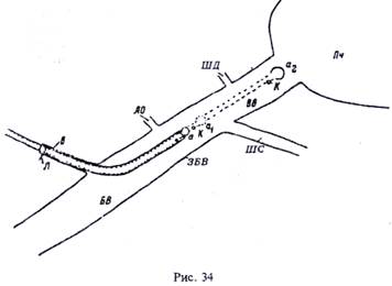 жового катетера (рис. 34, де В — гілка брижової вени; БВ — брижова вена; ЛО —ліва ободово-кишкова вена; ЗБВ —загальна брижова вена; ШС — шлунково-селезінкова вена; ПТД — шлунково-дванадцятипалакишкова вена; ВВ — ворітня вена; а — ангіокатетер в закритому положенні з боку судини; а, — інкатетер у висунутому положенні при взятті крові із загальної брижової вени через обидва катетери; а2 — положення інка-тетера при взятті крові з ворітної вени (через його) та із загальної брижової вени (через зовнішний катетер); К — отвір інкатетера; Л- — лігатура; Пч — печінка), який фіксується в будь-яких судинах, віддалених від ворітної вени. Для брижового катетера найдоцільніше брати ангіокатетер, що закривається з боку судини. В період операції вимірюють довжину від місця знаходження кінчика катетера до входження в дану судину бокових гілок. В період досліду, користуючись цими вимірюваннями, вводимо ін-катетер, таким чином одержуємо кров з різних ділянок шлунково-кишкового тракту через вставлений єдиний основний катетер (рис. 34).