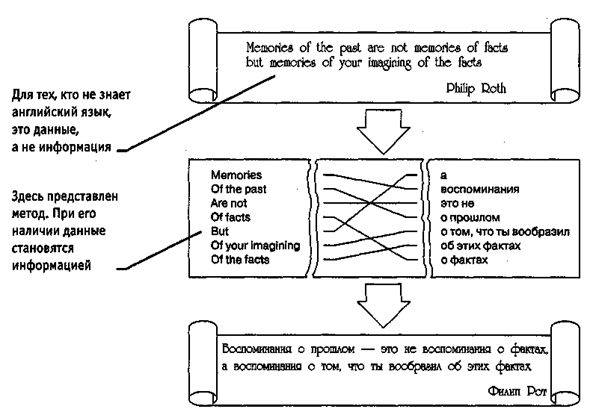 Анализируя этот пример, мы видим, что здесь речь идет о данных и методах. Прежде всего, здесь автор прямо говорит о целой группе методов, связанных с наблюдением и анализом, и даже приводит вариант конкретного алгоритма, адекватного рамкам его гипотетического эксперимента (посмотреть, запомнить, открыть...). Автор неоднократно подчеркивает требование адекватности метода (дикарь должен быть смышленным, а наблюдатель должен быть особо внимательным), без которого информация может и не образоваться.