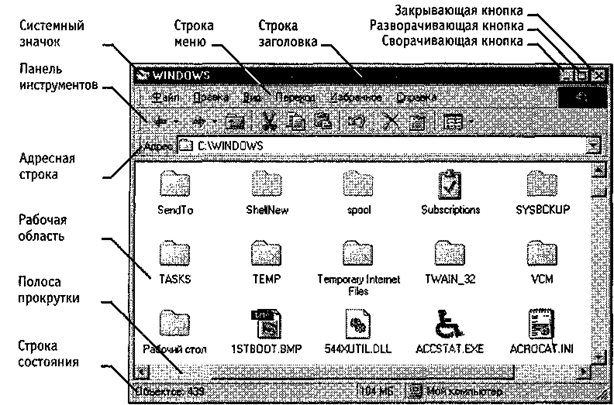 На рис. 5.2 представлено окно папки C:\Windows. Такая папка имеется на компьютерах, работающих в операционной системе Windows 98. Окно папки содержит следующие обязательные элементы.
