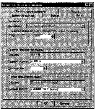 Настройка даты логического столетия выполняется в диалоговом окне Свойства: Язык и стандарты, которое открывают щелчком на значке Язык и стандарты в окне Панель управления. Необходимые элементы управления представлены в группе Календарь на вкладке Дата.