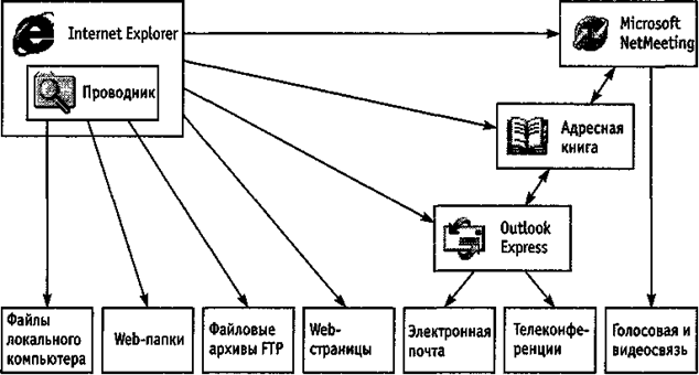 Примером броузера, предназначенного для просмотра Web-документов, может служить Internet Explorer 5.0. Программа предоставляет единый метод доступа к локальным документам компьютера, ресурсам корпоративной сети Intranet и к информации, доступной в Интернете. Она обеспечивает работу с World Wide Web, предоставляет идентичные средства работы с локальными папками компьютера и файловыми архивами FTP, дает доступ к средствам связи через Интернет. Соответствующие программы (Outlook Express и Microsoft NetMeeting) автономны, но рассматриваются как часть пакета Internet Explorer 5.0. Схема использования Интернета через Internet Explorer представлена на рис. 9.1.