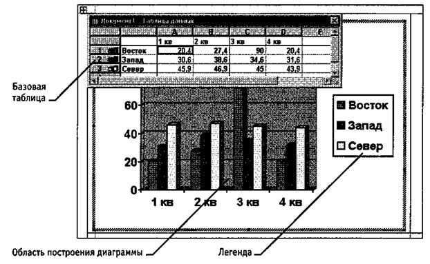 Создание диаграммы начинается с создания базовой диаграммы командой Вставка > Объект. В открывшемся диалоговом окне Вставка объекта следует выбрать пункт Диаграмма Microsoft Graph 2000, после чего в документ вставляется диаграмма, с которой связана некая базовая таблица (рис. 11.5). Рассматривайте эту таблицу как шаблон. Ее ячейки следует заполнить собственными данными, причем заполнение можно автоматизировать путем импорта данных из какой-либо иной таблицы, например из таблицы Microsoft Excel.