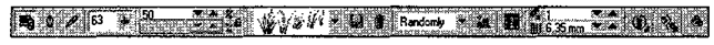 При выборе инструмента Brush (Натуральное перо фиксированной ширины) появляется возможность выбора типа кисти, при выборе каллиграфического пера — выбора угла его наклона. При выборе инструмента Аэрограф на панели свойств появляются дополнительные элементы: поля установки размеров элементов заполнения (по вертикали и горизонтали, в процентах от исходного размера) с кнопкой разрешения (запрещения) пропорционального масштабирования; список выбора типа заполнения; кнопки сохранения или удаления типа заполнения; список выбора порядка заполнения; кнопка добавления модифицированного заполнения к используемому типу; кнопка вызова диалогового окна модификации типа заполнения; счетчики установки интервала между столбцами и рядами элементов заполнения; кнопка изменения угла поворота элементов заполнения; кнопка выбора параметра смещения элементов заполнения; кнопка сброса всех внесенных изменений и возврата к значениям по умолчанию для данного типа заполнения.