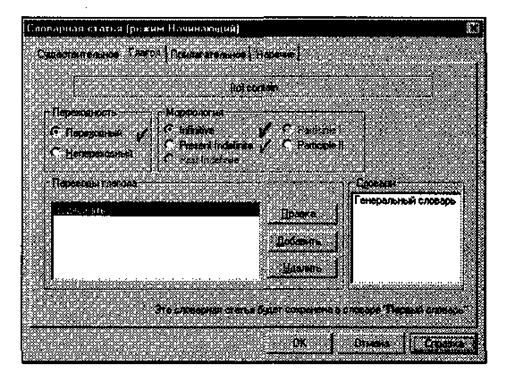 Для того чтобы внести слово в словарь, надо выделить его и щелкнуть на кнопке Словарная статья на панели инструментов Перевод. В диалоговом окне Открыть словарную статью нужно указать начальную форму слова и выбрать словарь, в который будет внесено это слово. После этого откроется диалоговое окно Словарная статья, используемое для добавления слова (рис. 17.5).