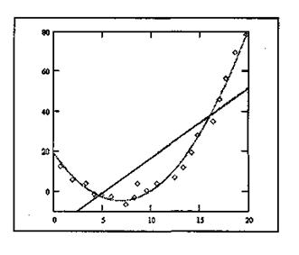 | Рис. 18.1. Набор точек аппроксимирован с помощью многочленов первого и второго порядка |