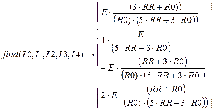 4. Введите функцию find, перечислив в качестве параметров неизвестные I0, I1, 12, I3, I4. Затем введите оператор аналитического вычисления, который выглядит как стрелка, направленная вправо, и вводится комбинацией клавиш CTRL+. Или кнопкой Evaluate Symbolically (Вычислить аналитически) на панели инструментов Evaluation (Вычисление).