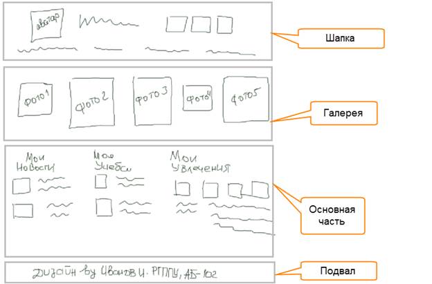 1. Продумайте идею и композицию страницы, нарисуйте эскиз. Обязательно предусмотрите следующие зоны: шапка, галерея, основная часть, подвал.