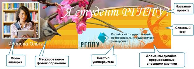2. В шапке предусмотреть следующие элементы: фотографию-аватарку, название проекта «Я студент РГППУ!». Фон шапки прорисовать самостоятельно, используя внешние кисти, градиенты, сложные переходы тонов, элементы коллажирования и т.п. В композиции фона отразить личные предпочтения: спорт, живопись, танцы, природа и т.д. Для текста использовать различные шрифты.