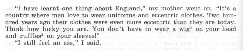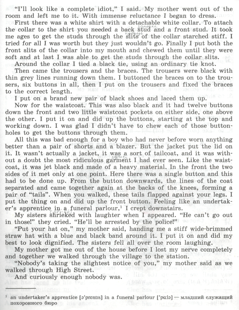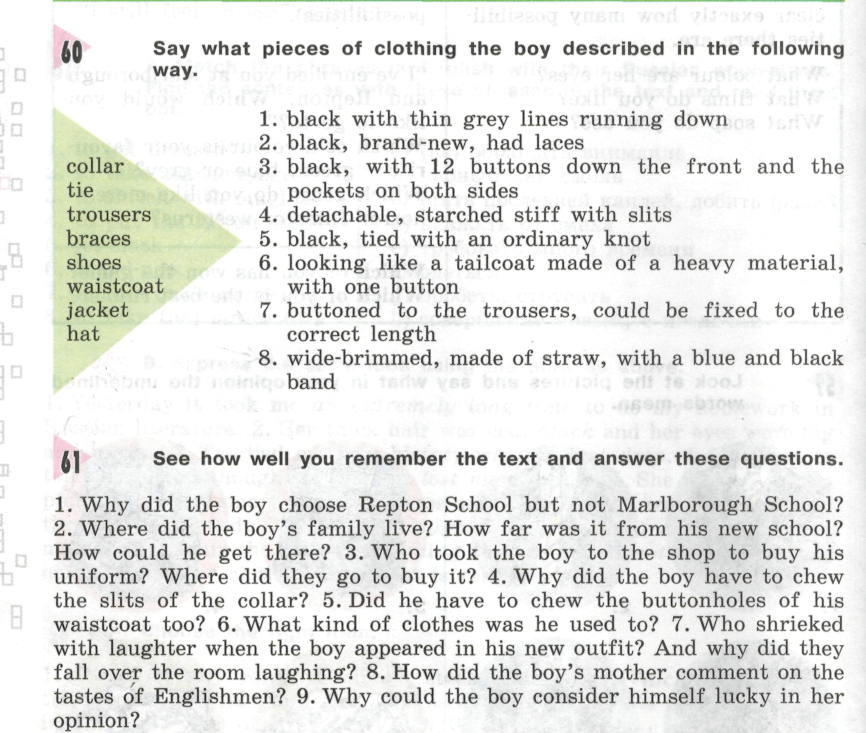 1. What things do you usually do with reluctance? 2. Do you like chewing gum? What are your favourite kinds? 3. What can flap in the wind? 4. Have you ever seen a funeral procession? Are funerals always held at churches? 5. Have you ever worn a tie? When was it? Did you like it? Do girls ever wear ties? What do you think of this? When and where do people usually wear ties? 6. Have you ever looked or felt ridiculous? When was it? What made you feel like that? 7. Have you ever worn starched clothes? How do you feel in them? 8. Have you got a sports outfit? What is it like? 9. What things can you tie with string? 10. What is a fancy dress? What is a fancy-dress party/ball? 11. Do you think that dignity is important for life? Why (not)? 12. When we speak about people who are dignified we usually mean people who are not very young. Can you explain that? 13. What houses can be described as detached? 14. Why do you think people say that they feel stiff after a long walk? 15. What parts of our dress can be detachable? 16. What books in your opinion are worth reading?