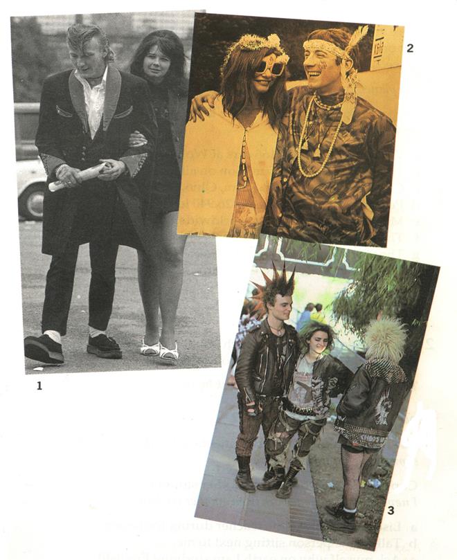 The first group to be seen in the newspapers in the late 50s were Teddy Boys. Their clothes were supposed to be similar to those worn in Edwardian England (Ted and Teddy were abbreviations of Edward): long jackets with velvet collars, drainpipe trousers (so tight they looked like drainpipes!) and brightly coloured socks. Their shoes had very thick rubber soles and their hair was swept upwards and backwards. Before the arrival of the Teddy Boys young people usually wore what their parents used to. Now they wore what they liked.