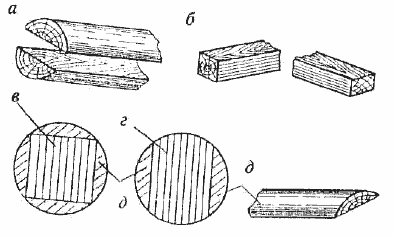 | Сортамент пиленного материала а) распил; б) брусья; в) доски обрезные («затяжка»);г) доски необрезные («затяжка»); д) обаполы (горбыли). |
