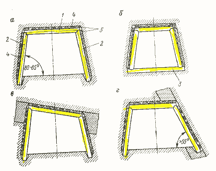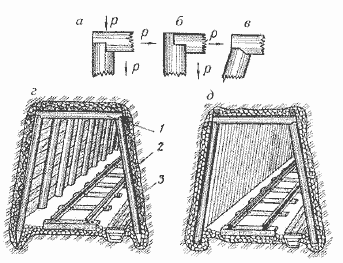 Основной конструкцией деревянной крепи является неполная крепежная рама Рис а,в,г. Состоит из верхняка 1, и двух соек 2. Реже применяют полные крепежные рамы, Рис б, когда добавляют четвертый элемент – лежень 3. Неполные крепежные рамы применяют в породах с f= 3-9, а полные – с f=1-2 и пучащих породах. Крепежные рамы трапециевидной формы с горизонтальным верхняком и углом наклона стоек в раме 80-850 применяют при любом угле залегания пласта. До 20-250 рамы устанавливают с наклонным верхняком по кровле пласта Рис в, при крутом залегании (более 550) – с горизонтальным верхняком и наклоном одной стойки по кровле пласта.