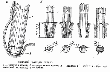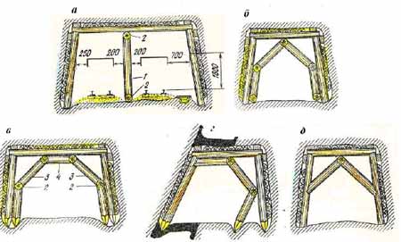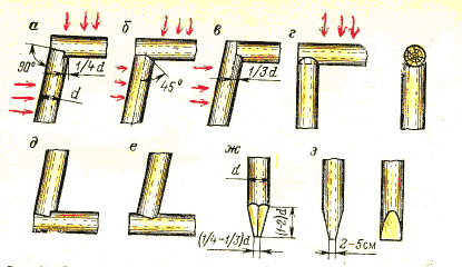 | Соединение элементов крепи и узлы податливости деревянных рам. а, б, в – стоек и верхняка в лапу, г- в паз; д- стоек и лежней в лапу, е – в зуб; ж – заострение стоек на конус; з – в виде клина. |