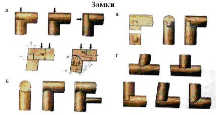| Замки А- соединение в лапу.Б- соединение в паз.В- соединение в шип.Г- соединение стоек с лежнем. |