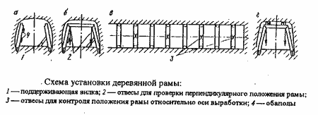 Пустоты между затяжкой и стенками выработки заполняют мелкой породой («забутовка»). Для обеспечения крепи продольной устойчивости между соседними рамами устанавливают в верхних углах и посредине стоек вдоль выработки распорки.