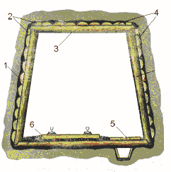 | Полная крепежная рама: 1- стойка; 2- клинья; 3- верхняк;4- затяжка; 5- трап; 6- лежень. |